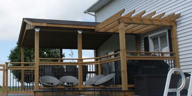 Pergolas are built using crossbeams and rafters across the top. They may be covered with fabric to create shade. Pergolas add a decorative element to your backyard. They do not have a floor system. Often they are used in gardens, or around pools to add a little extra shade while still allowing the outdoor elements to be enjoyed.